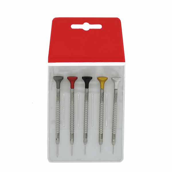 Watchmaker Screwdriver 5 Piece Set is supplied in a handy little pouch. Screwdrivers supplied are Ø 0.60-0.80-1.00-1.20-1.40 mm.