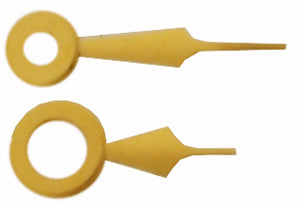 pair of hour and minute hands, yellow colour, modern, length of minute hand 6.00 mm, Bulova® part number 6AHC 63-64 GM12, to fit: calibers 6AH, 6AK, 6AM, 6AZ, 6BA, 6BC, 6BD, 6BE, 6BK, 6BL, 6BM, 6BO, 6CS, 6CB, 6CE, 6CF, 6CL, 6CS, 6CT, 6EA, 6EB (hole size: 60/109 (minute/hour))