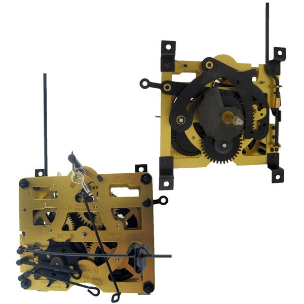 Regula 25 Mvmt is a 1 day cuckoo movement that comes complete with bird rod, chains, stop rings, weight hooks, hand nuts and an extended post for the music activation lever. Regula 25 Movmt has a pendulum length of 19.5 cm (measured from the suspension post to the centre of the pendulum leaf) and a plate size of 73 x 63 mm. Regula 25 Mvmt requires 2 weights of 275 grams each which can be purchased separately.