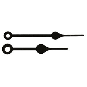 Black Spade Hour & Minute Hands 2 13/16" for Push-On clock movements, are supplied as a pair. These style "G" hour and minute hands measure 2 13/16" long or 71.4mm. The hour hand has a round hole (5.0 mm (13/64”)), minute hand has round hole (3.4 mm (9/64”)). Length of hand indicated is the length of the minute hand from the center of the hole to the tip of the hand, supplied with matching hour hand.