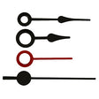 Alarm Clock Hands 1 1/16" Push on black Spade style hour and minute (27.0 mm (1-1/16")) hand, black seconds hand (28.6 mm (1- 1/8")), and red alarm hand (19.1 mm (3/4")). Hour hand hole size is 5.0 mm (13/64”), minute hand 3.2 mm (1/8”) and the alarm hand is 4.3 mm (5/32“). Supplied as a complete set only.