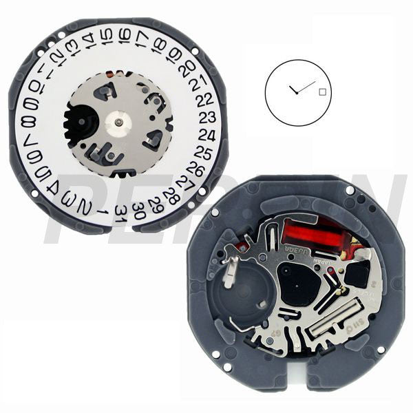 VJ34 SII Quartz Watch Movement VJ34 SII Quartz Watch Movement is a 2 hand movement (hour/minute) with a date window at the 3 o'clock position. This gents movement is a 10 1/2 ligne movement, dimensions are 21.30 mm x 22.6 0mm with a thickness of 2.7 1mm. Height over the dial seat 1.17 mm. Hand dimensions are 120/70 (h/m). 0 jewel movement, uses 364 battery. Stem is part number 351-332 (tap 0.90 mm/ tap 10).
