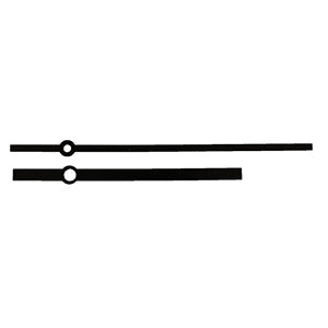 Black Narrow Stick Hour & Minute Hands 4" for Push-On clock movements, are supplied as a pair. These style "F" hour and minute hands measure 4" long or 101.6mm. The hour hand has a round hole (5.0 mm (13/64”)), minute hand has round hole (3.6 mm (9/64”)). Length of hand indicated is the length of the minute hand from the center of the hole to the tip of the hand, supplied with matching hour hand.
