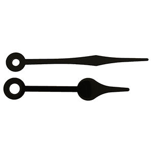 Black Spade Hour & Minute Hands 2 9/16" for Push-On clock movements, are supplied as a pair. These style "F" hour and minute hands measure 2 9/16" long or 65.1mm. The hour hand has a round hole (5.0 mm (13/64”)), minute hand has round hole (3.6 mm (9/64”)). Length of hand indicated is the length of the minute hand from the center of the hole to the tip of the hand, supplied with matching hour hand.