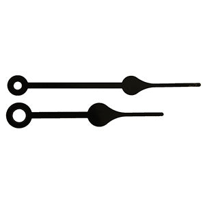 Black Spade Hour & Minute Hands 2 3/4" for Push-On clock movements, are supplied as a pair. These style "F" hour and minute hands measure 2 3/4" long or 69.9mm. The hour hand has a round hole (5.0 mm (13/64”)), minute hand has round hole (3.6 mm (9/64”)). Length of hand indicated is the length of the minute hand from the center of the hole to the tip of the hand, supplied with matching hour hand.