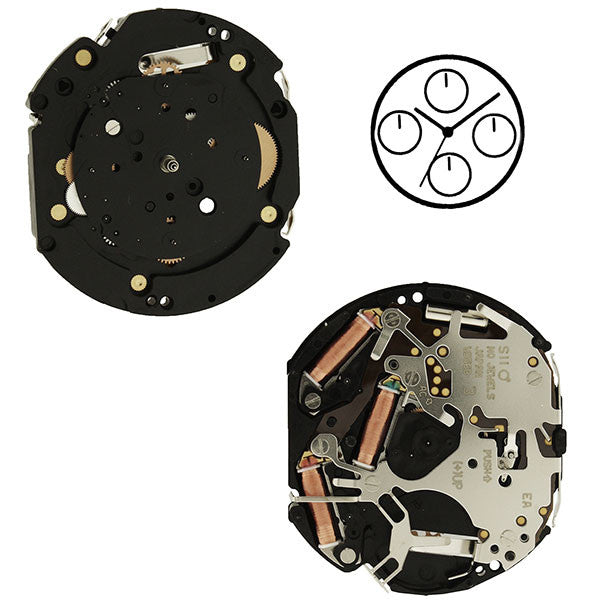 VD56 Height 2 SII Quartz Chronograph Watch Movement VD56 Height 2 SII Quartz Chronograph Watch Movement is a 3 hand movement (hour/minute/sweep seconds) with 4 indicators. The indicator at the 3 o'clock position records 24HR, the indicator at the 6 o'clock position records up to 60 seconds, the indicator at the 9 o'clock position records up to 60 minutes, and the indicator at the 12 o'clock position records 1/10th seconds. This gents movement is a 12 3/4 ligne movement, dimensions are 26.00 mm x 29.50 mm with a thickness of 3.97 mm. Hand dimensions are 110/65/20/221 (h/m/s/indicators). 0 jewel movement, uses 371 battery. Stems are available in a multiple of stem thread (tap) diameters. Tap 0.90 mm (10) use stem number 351-178, Tap 0.80 mm (11) use stem number 351-890. Total movement height is 6.65 mm.