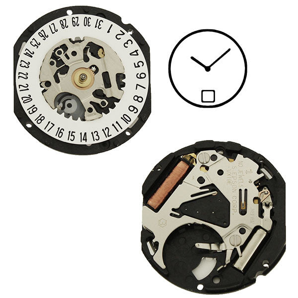 VX19 Date 6 Epson Quartz Watch Movement is a 2 hand movement (hour/minute) with date at the 6 o'clock position. This ladies movement is a 8 3/4 ligne movement, dimensions are 18.00 mm x 20.00 mm with a thickness of 2.60 mm, overall movement height is 3.92 mm. Hand dimensions are 110/65 (h/m). 0 jewel movement, uses 315 battery. Stems are available in a multiple of stem thread (tap) diameters. Tap 0.90 mm (10) use stem number 351-177, Tap 0.80 mm (11) use stem number 351-892.