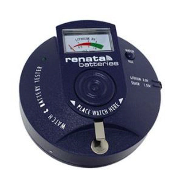 Renata Watch and Battery Tester Renata Battery Tester is a cell tester as well as an Impulse Detector. This is a compact and rugged well tester. Tests silver oxide (1.55V) and lithium (3V) batteries. Features a built in impulse detector which indicates with sound and light if the electronic portion of the watch is working and putting out a drive impulse to the rotor, without opening the watch. This device relies on the latest 3V technology and is powered by a Renata CR2430 lithium battery.