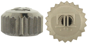 Steel colour, domed waterproof crown, genuine with logo, diameter 6.20 mm, fits tube 2.50 mm, total height of the crown is 4.00 mm, flush pipe, fits stem 1.20 mm. This crown is used to turn the bezel. Fits vintage Tissot® case number 40602