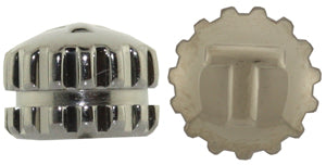 Steel colour, domed top, large knurl, special design, waterproof crown, genuine with logo, diameter 4.90 mm, fits tube 2.00 mm, total height of the crown is 3.50 mm, flush pipe, fits stem 0.90 mm. Fits Tissot® case numbers R460, R463. Tissot part number is T350.593 or T350006725