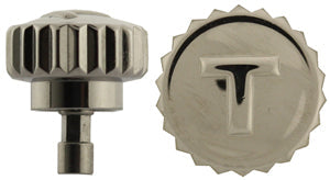 Polished steel colour, threaded waterproof crown, genuine with logo, T-shaped, slightly domed, diameter 6.50 mm, fits tube 2.60 mm (threaded on the inside of the case tube), total height 7.55 mm, fits stem 1.20 mm. Will fit Tissot® tube T358.389. Tissot® part number for the crown is T350.603 or T350006734